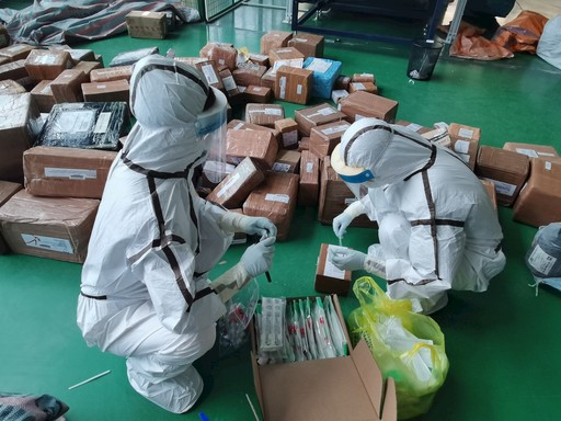 自6月8日零时起,安徽省合肥市成为北京国际客运航班第一入境点。合肥国际邮件互换局迅速应对,加强场地和人员防疫工作,确保进口邮件安全。图为6月16日,合肥海关工作人员在现场对国际进口邮件进行核酸检测。 □通讯员  凌云  记者  方怀银  摄影报道