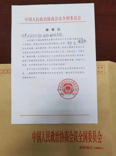 3月10日,中国人民政治协商会议全国委员会办公厅向石景山区分公司寄来感谢信,对邮政两会服务工作给予充分肯定和衷心感谢。信中表示,石景山区分公司郝飞、张宇燕同志在大会期间加班加点,恪尽职守、热情服务,出色地完成大会秘书处交办的各项工作任务。