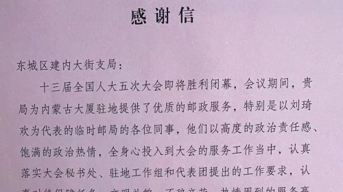 辽宁代表团在感谢信中提到,“建内大街支局秉承‘人民邮政为人民’的服务宗旨,为广大代表提供了优质、高效、务实的用邮服务和丰富的邮政产品,受到了与会代表和工作人员的认可和赞许,投递员清晨就将当天的会议用报及邮件送到驻地,保证了时限。在此向中国邮政致以诚挚的感谢,并提出表扬!”