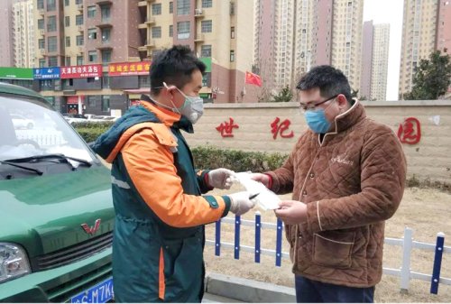 2月5日是亳州市首个开放限购口罩的日子,当天市分公司收到订单后,第一时间配送口罩。下午15时,家住世纪花园的张奎从邮政快递员丁伟杰手上接过口罩,成为亳州市第一位收到政府限购口罩的市民。