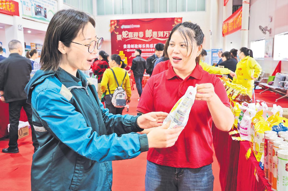 自12月以来,广西壮族自治区贵港市邮政分公司在全市举办多场2025年邮乐购新春快消品展销会(邮乐购感恩答谢会),约120家经销商、1200名客户受邀参加。通过举办展销订货会,贵港市分公司密切了与经销商的合作关系,提升了客户的活跃度,为2025年发展优质客户打下了基础。展销会通过现场选购、线上下单的方式,实现总订货额450万元。图为邮政工作人员在展销会现场向客户介绍商品。