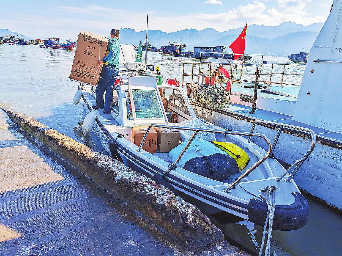 如今,石进全投递的邮件大都是渔民网购的商品。  □吕文礼 摄