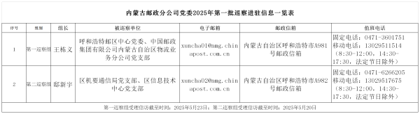 根据内蒙古邮政分公司党委工作部署,截至5月12日,党委2025年第一批巡察完成进驻工作,2个巡察组对4个区分公司各直属单位(党委)党支部开展专项巡察。