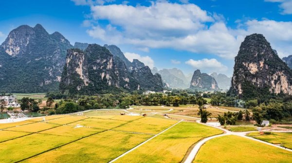 金色稻浪与喀斯特峰林相映成一派“丰”景